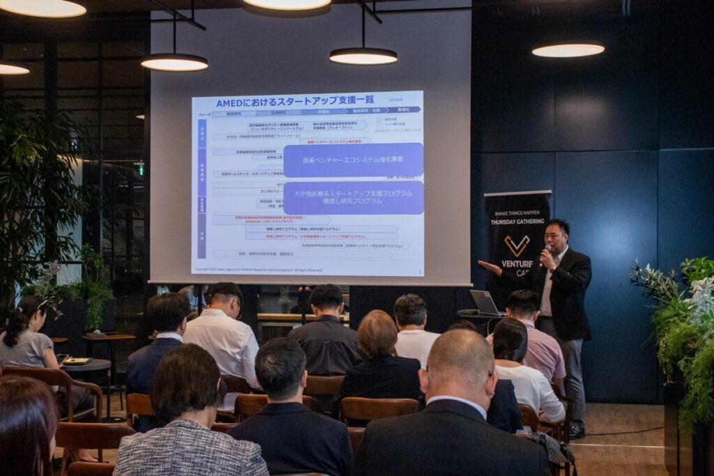 まず、ぜひ知っておいてもらいたいAMEDの2つの支援プログラムとして「創薬ベンチャーエコシステム強化事業」と「大学発医療系スタートアップ支援プログラム」を紹介しました。前者は、AMEDが認定したVCからの出資額に対して、国が最大で同額を補助するマッチングファンド形式です。後者は「橋渡し研究プログラム」とも呼ばれ、九州大学など各大学が拠点となって、アカデミアやベンチャー企業の創薬、再生医療、医療機器開発を支援する仕組みです。