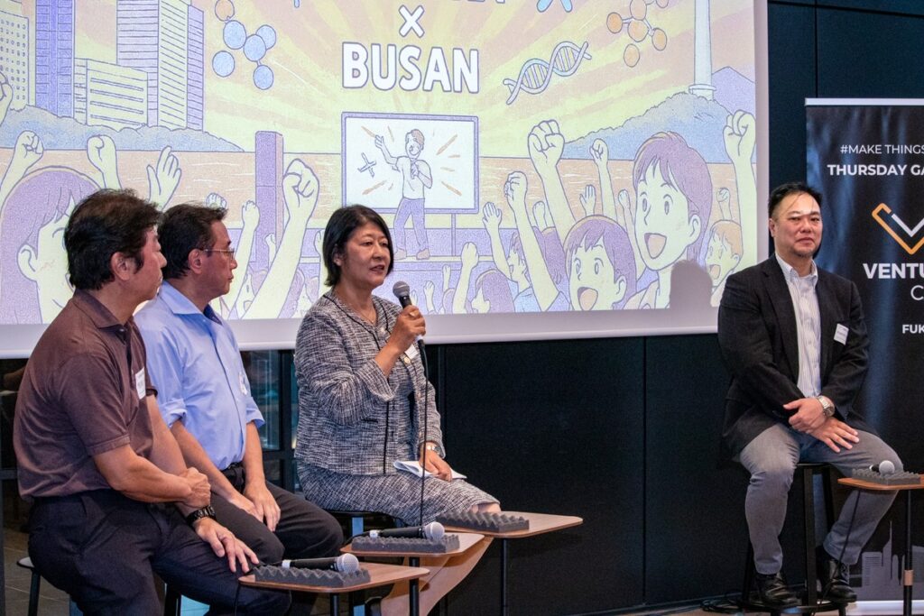 最初のセッション「Fukuoka Bio Night ①: 産官学連携のスタートアップ支援」では、国の政策立案、研究資金配分、大学での事業化、そして大手企業における新規事業開発と、それぞれの立場でバイオスタートアップ支援の最前線に立つ4名が登壇しました。