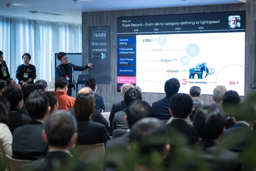 One Genomicsは九州大学発のゲノム編集技術シーズをもとに、米国で3年前に創業したスタートアップです。老化・遺伝性疾患治療を目指す同社には、昨年、ゲノム編集・合成生物学の先駆者であるGeorge Church氏(ハーバード大学)が参画し、新たな展開を加速させています。Church氏はNASDAQに上場したゲノム編集ベンチャーEditas Medicineの共同創業者であり、マンモス復活に取り組んでいることで話題になったスタートアップColossal Biosciencesの創設者としても知られる人物です。